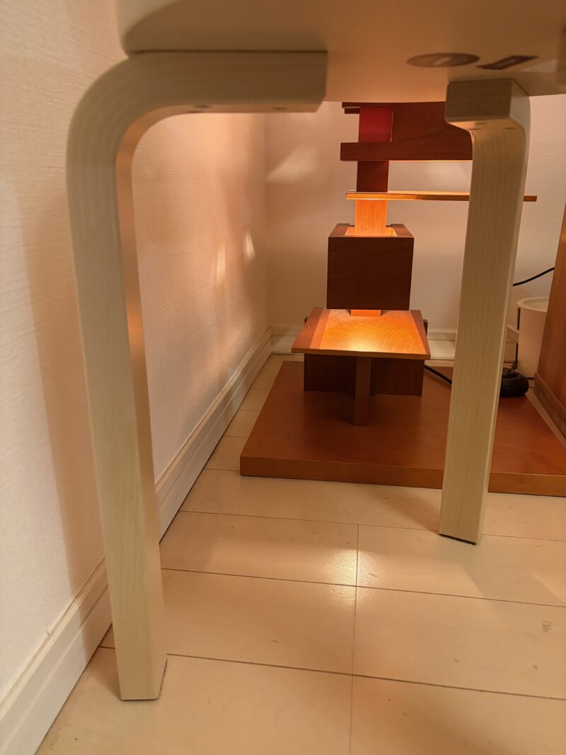 特徴は「アアルトレッグ」というL字の脚で、無垢材の先端から曲げる部分まで切れ目を入れ、その間に薄いベニヤ板を挟むことで、厚い無垢材をL字に曲げています。